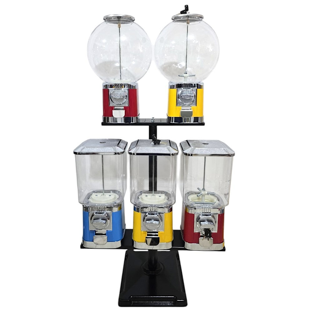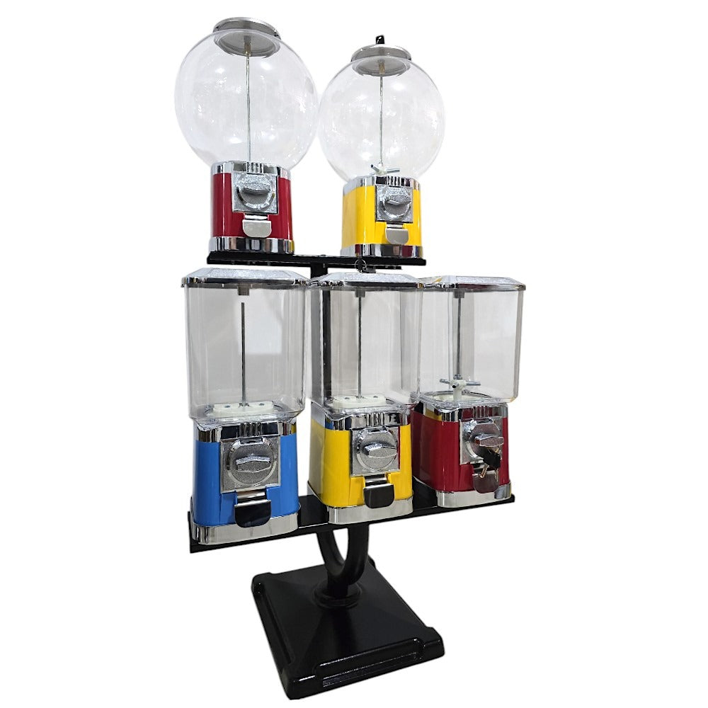 La máquina dispensadora de 5 Cabezas 2 en burbuja y 3 clasicas es la solución ideal para quienes buscan maximizar el espacio y las oportunidades de venta. Con cinco compartimientos, puedes ofrecer una variedad de productos en un solo lugar, lo que atrae a más clientes y aumenta tus ingresos. Este modelo no solo es robusto y duradero, sino que también permite una personalización total para que puedas combinar los productos que prefieras.